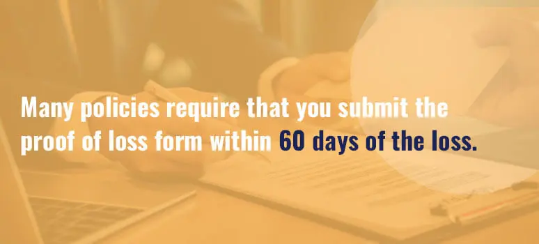 A public insurance adjuster can help ensure you submit a Proof of Loss form on time. Many policies require that you submit the form within 60 days of the loss. When completing the form, you should include claim estimates, inventories and all other supporting documents. Then, verify the details on the form are correct and get your document notarized.